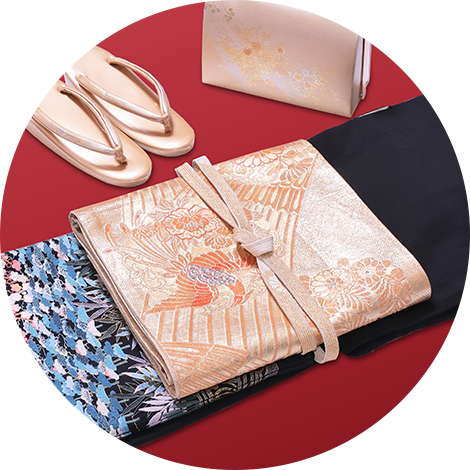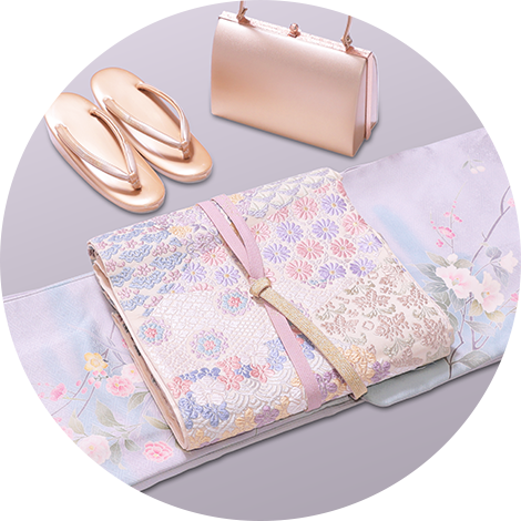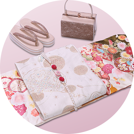 各着物一式内容基本セット:帯+着物+長襦袢+草履+鞄*+小物(足袋・肌着・紐・伊達締*・帯板・帯枕*・帯締・帯上げ*・コーリンベルト*) *男物には付きません。 追加オプション:髪飾り・ファーポンチョなど