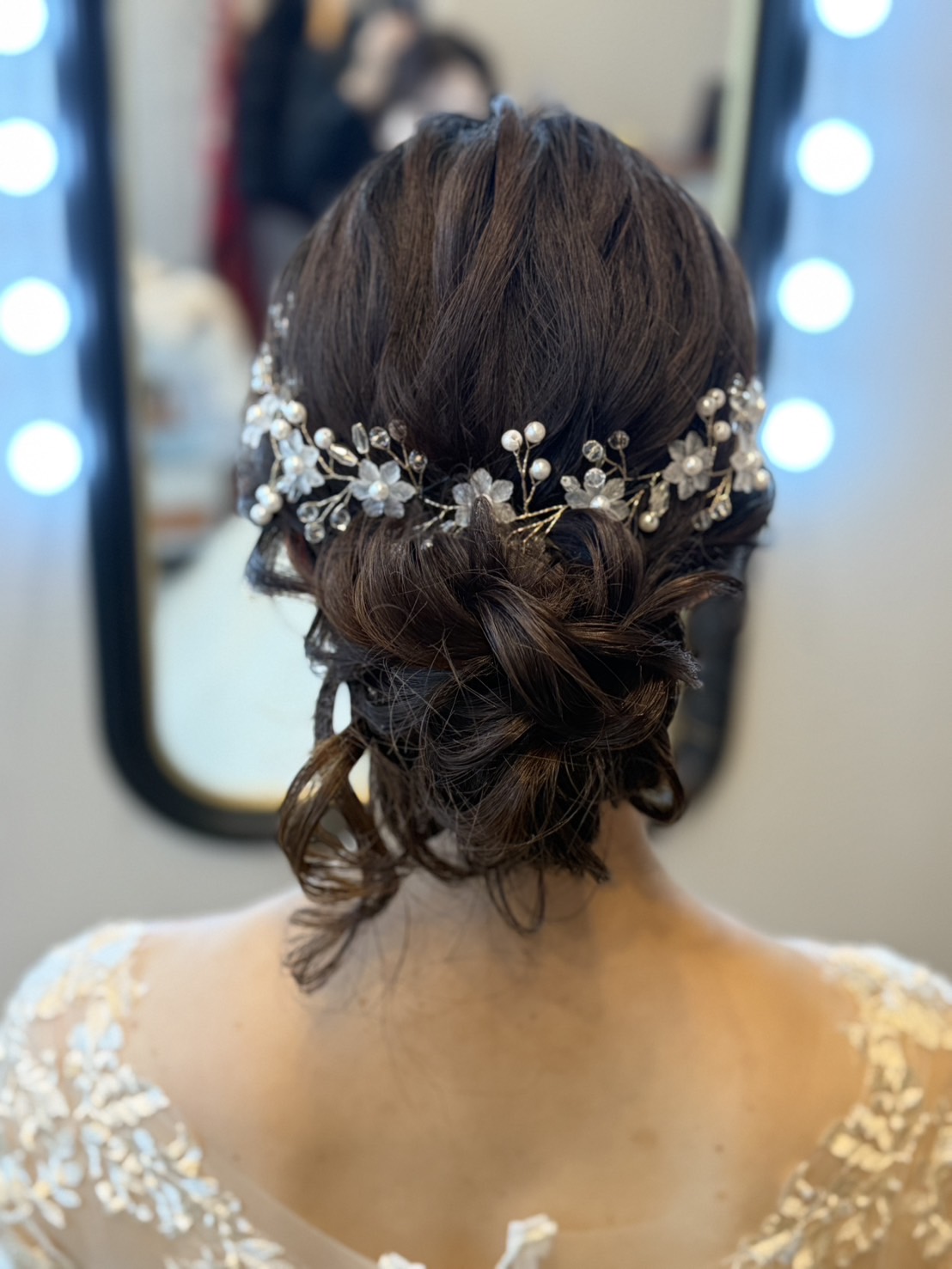 トップもお団子部分もふわふわの華やかなシニヨンにしました。