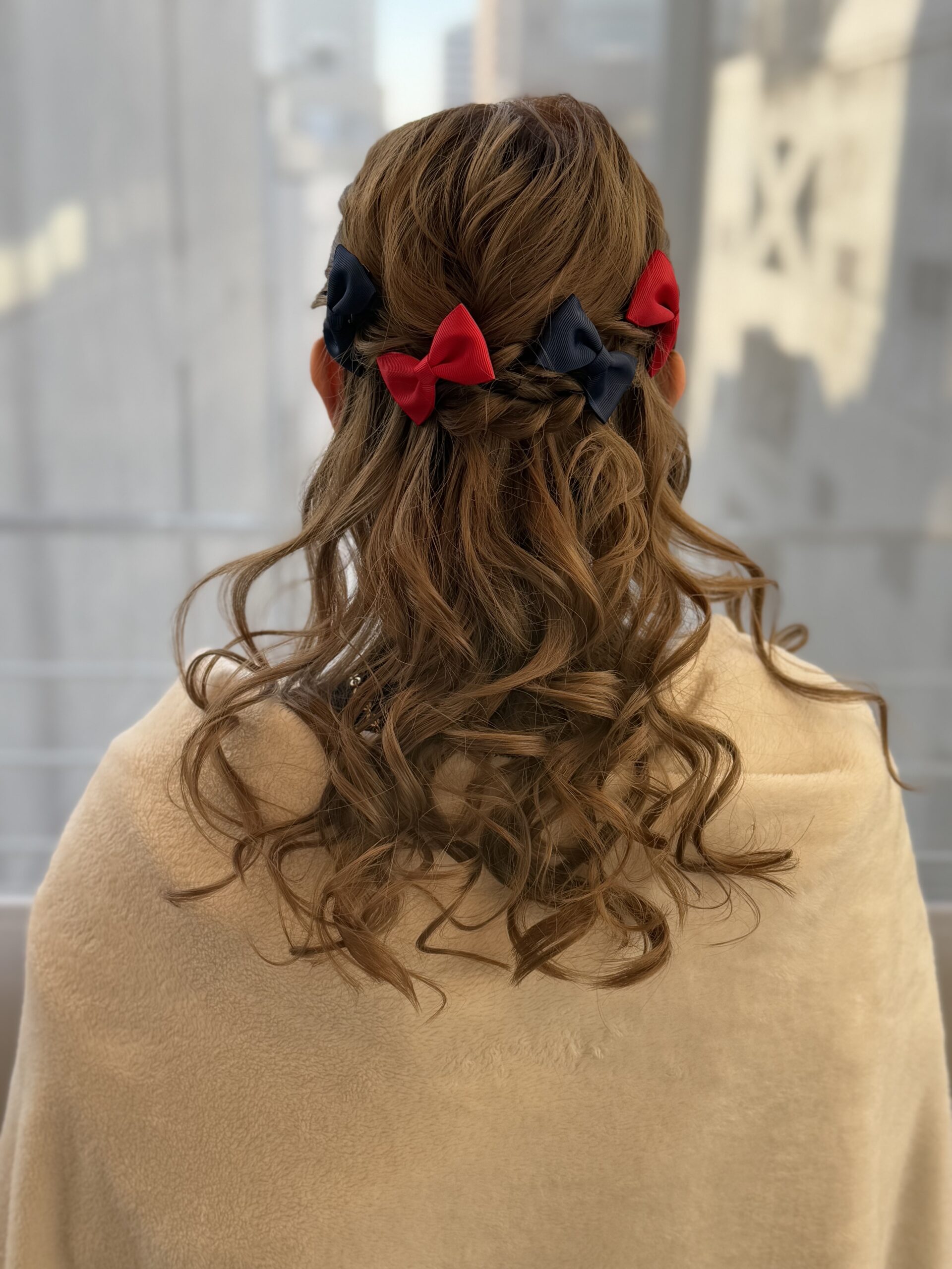 ふわふわのハーフアップに沢山リボンをつけたスタイルです。
