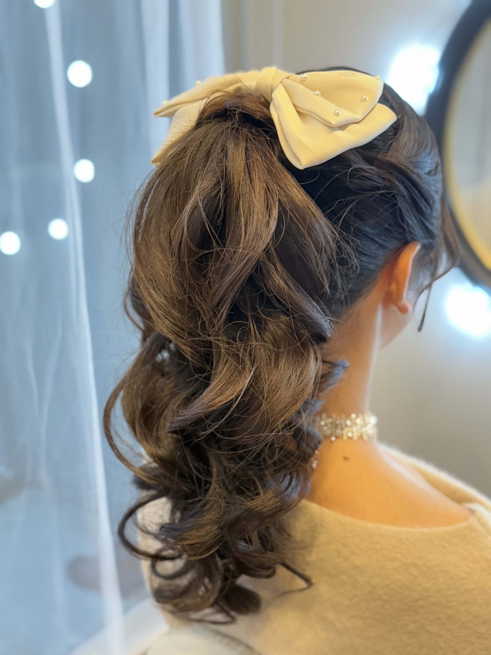 ふわふわのポニーテールですが、巻きに艶が出るよう上品な仕上がりにしました。