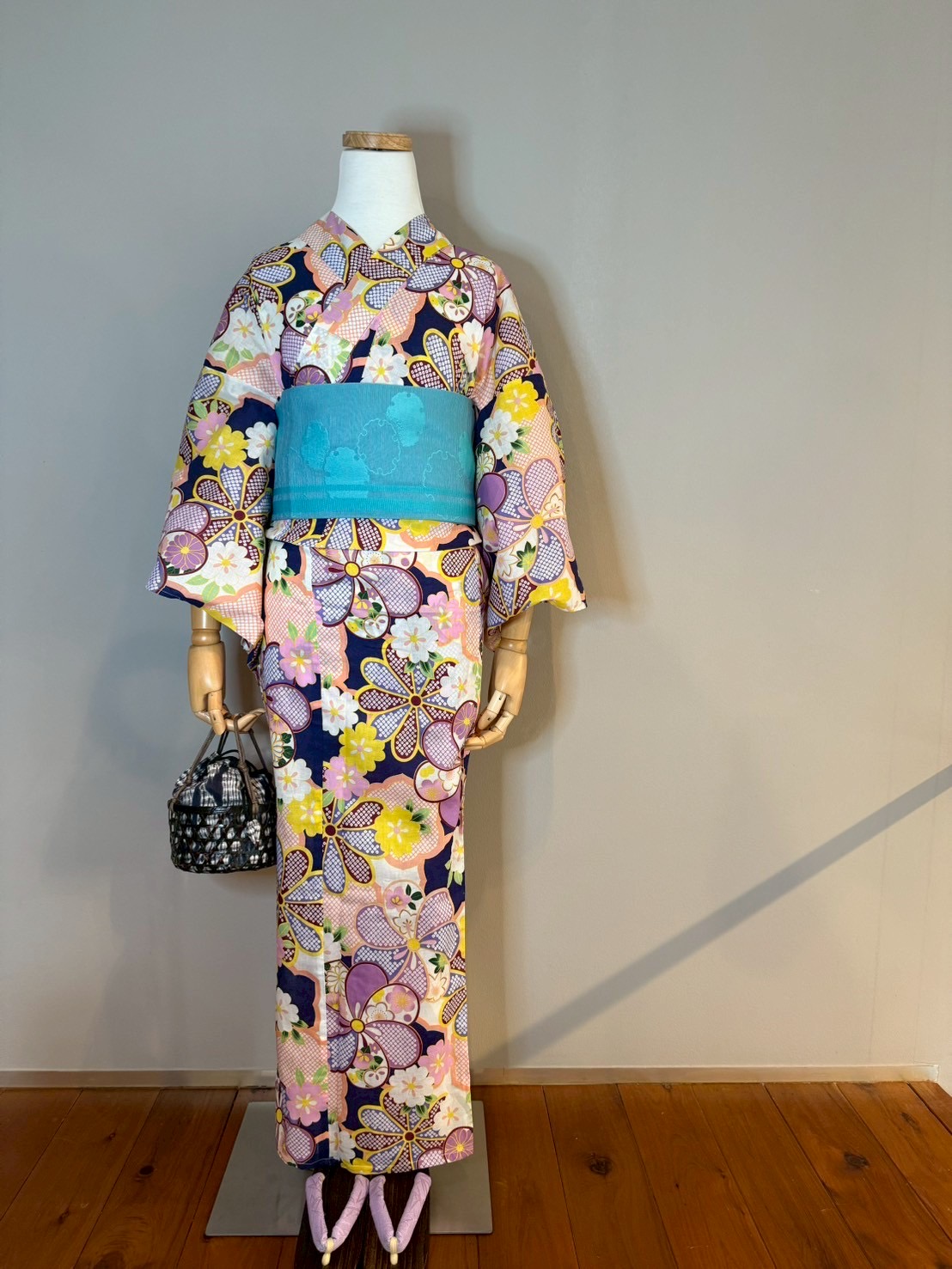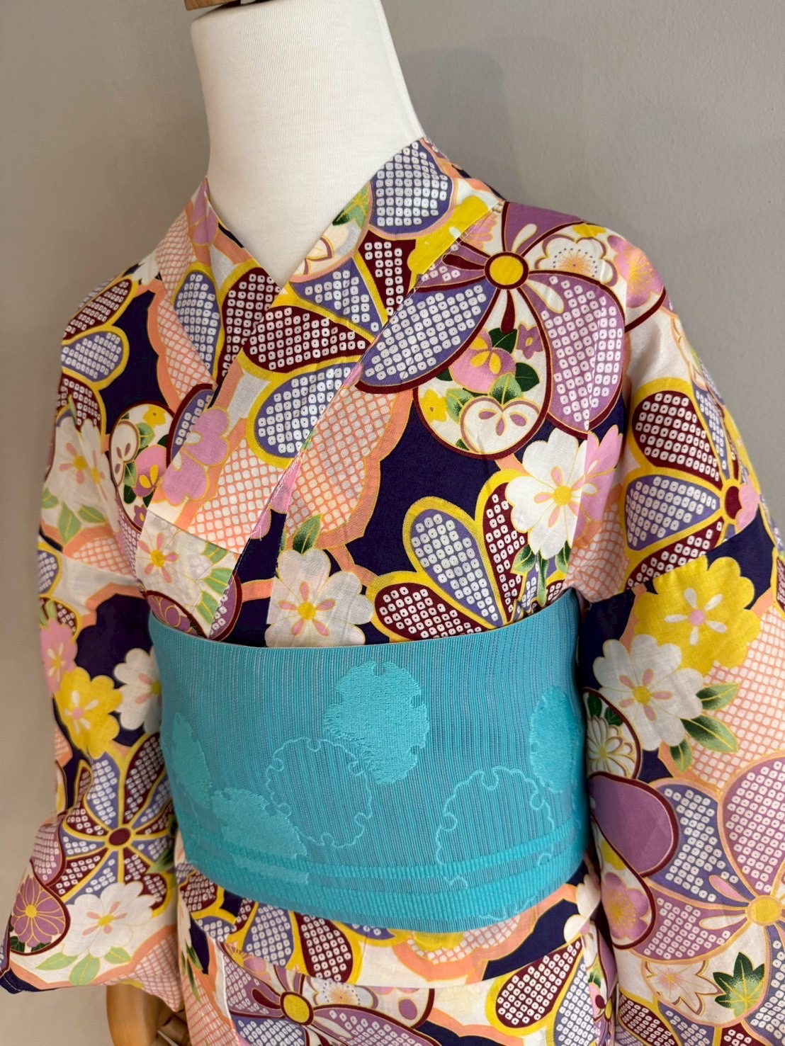 帯はあえての水色で、統一感を出しながらも少し遊びを加えたコーディネートとなっています。